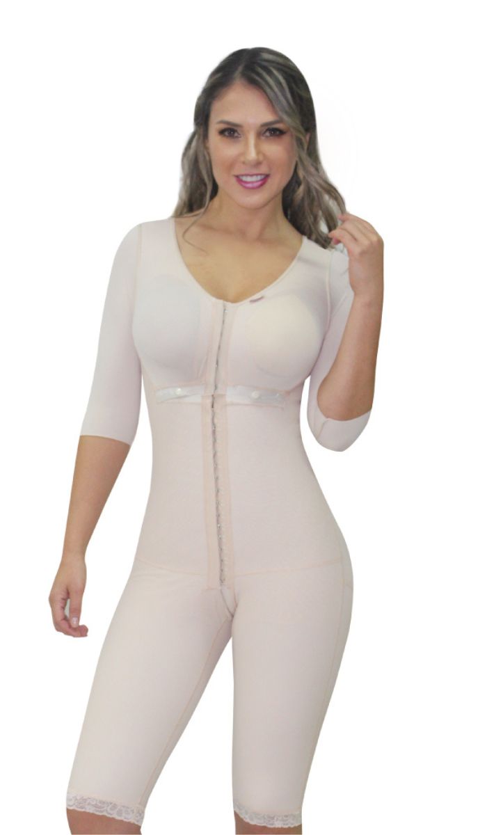 High compression postoperative girdle with a nametag in three positions on the abdomen, arms covered in lycra, buttock enhancement plus genital protector and bust fasteners.