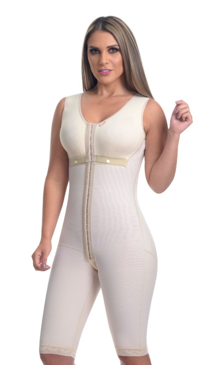 High compression post liposuction long leg girdle with three-position badge on the abdomen, buttock enhancement plus genital protector and bust fasteners.